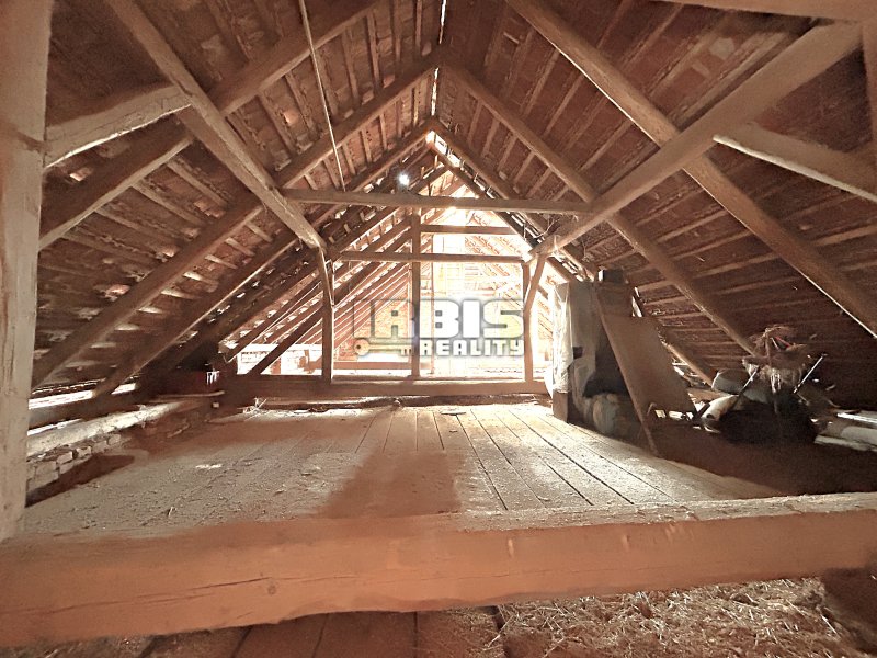 Dále je zde k dispozici dostatek užitných prostor: bývalý chlév, stodola a garáž. V horní části se také nacházejí 2 prostorné, oddělené, vyklizené půdy. Za vstupními vraty je k dispozici dřevěná kolna na nářadí s přístřeškem pro palivové dříví (rozměry cca 5,1 x 2,7 m).